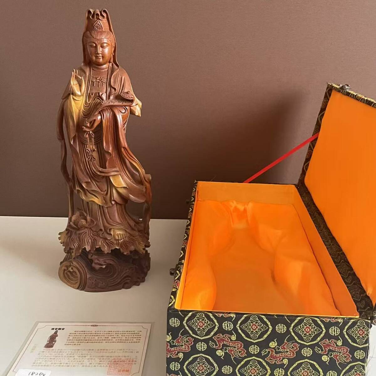 - 白檀 観音像 彫刻家 林金霖作 在銘 白檀木雕 香木木彫 オブジェ 白檀木彫り観音像 共箱