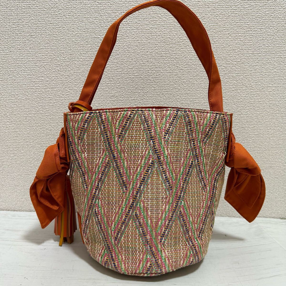 > 美品 LANVIN en Bleu ランバンオンブルー レディース ハンドバッグ トートバッグ パーティーバッグ 布地 レザー オレンジ ロゴ 可愛い 高級