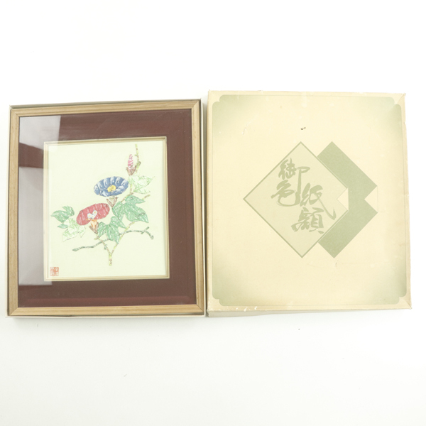 - 美品 全讃居士作 切手貼り絵 額装 朝顔図 色紙額 落款印 木製フレーム マット付 壁掛け 日本の手仕事 コレクション