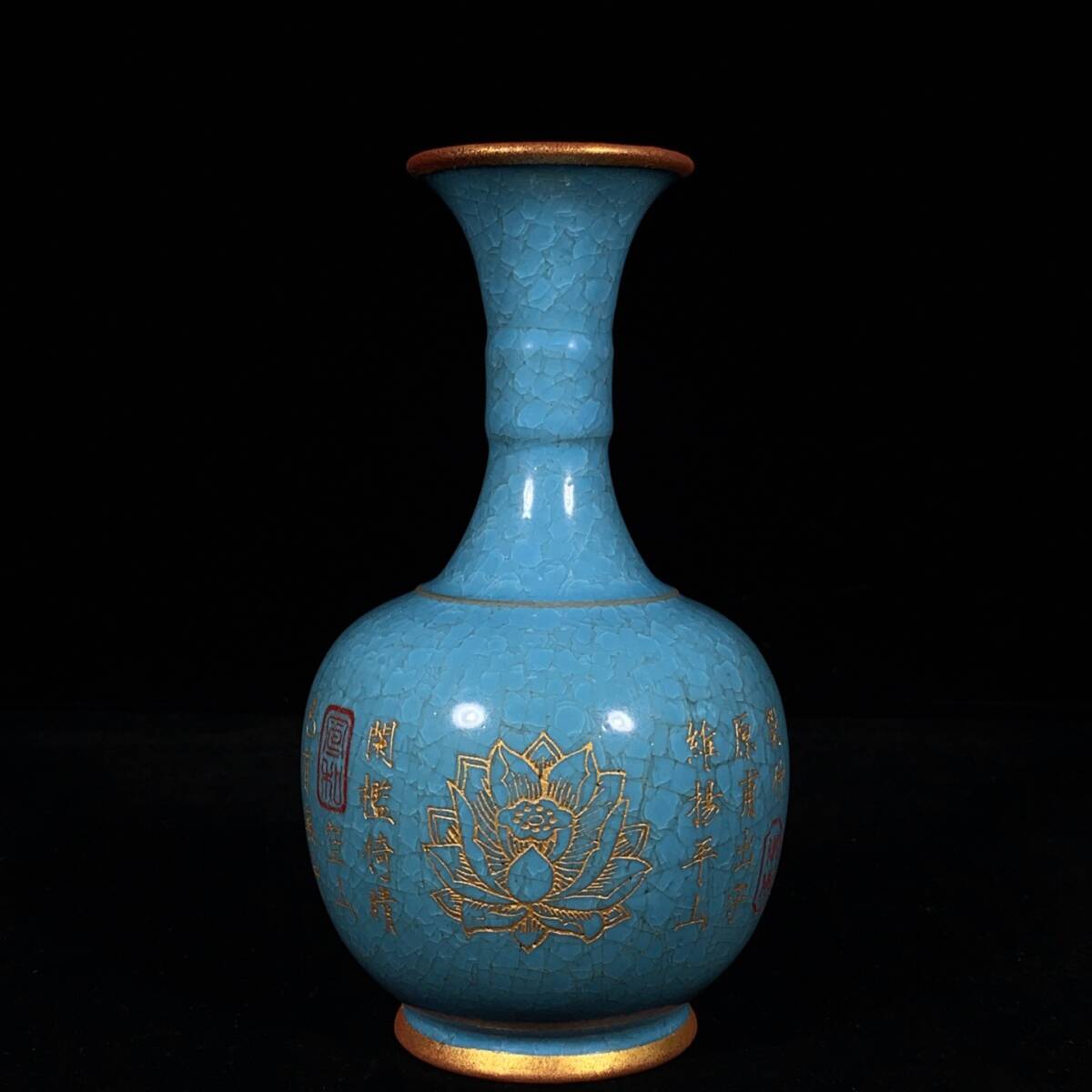 - 蔵友旧蔵出 宋 汝窯 冰裂紋 包口 銘文蓮花紋 竹節瓶 稀少珍品 貴重品 古陶瓷品 置物 古賞物 中国古玩 中国古美術品