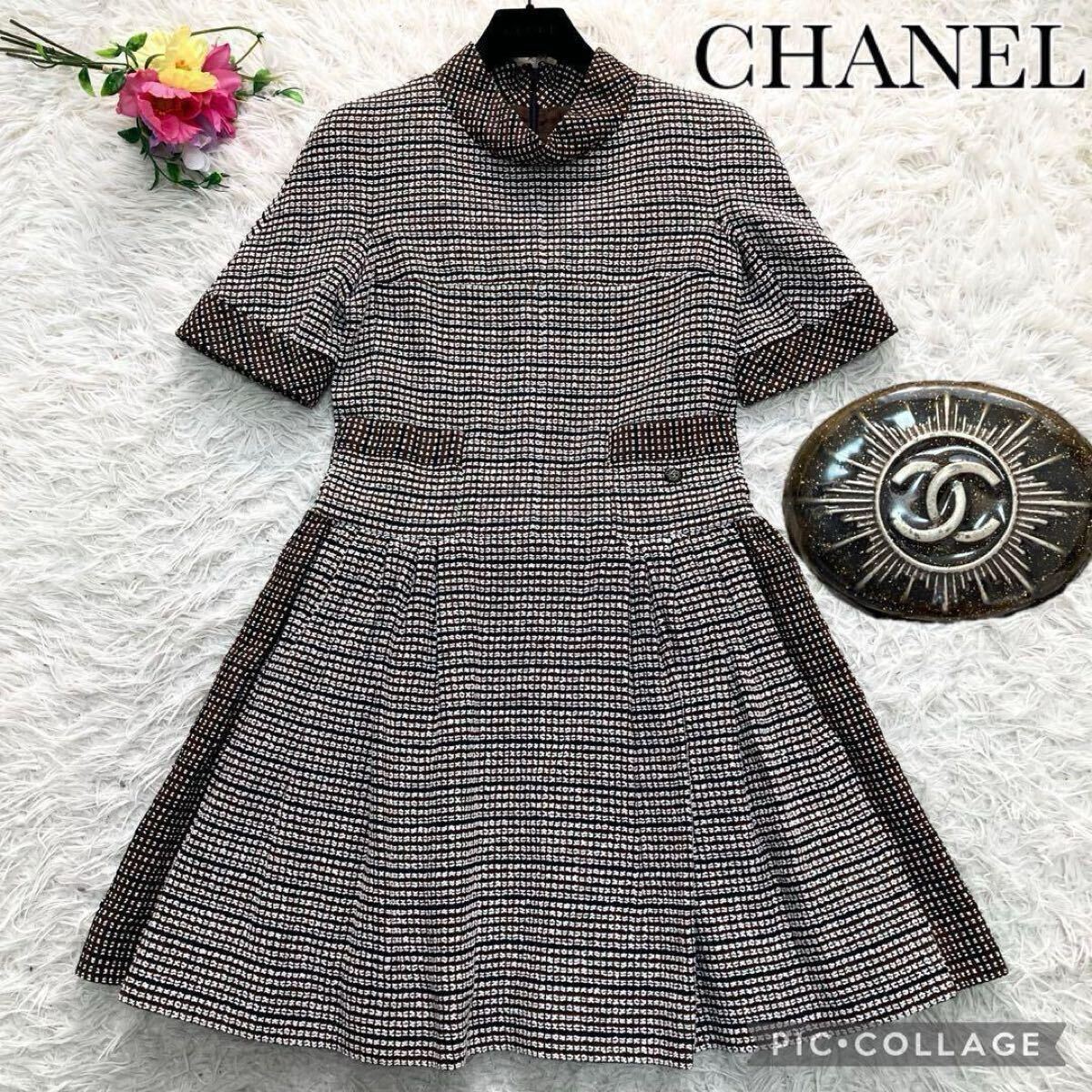 > 未使用級 CHANEL シャネル ワンピース ドレス ミックスツイード ブラウン ココマーク ボタン 半袖 ハイネック レディース