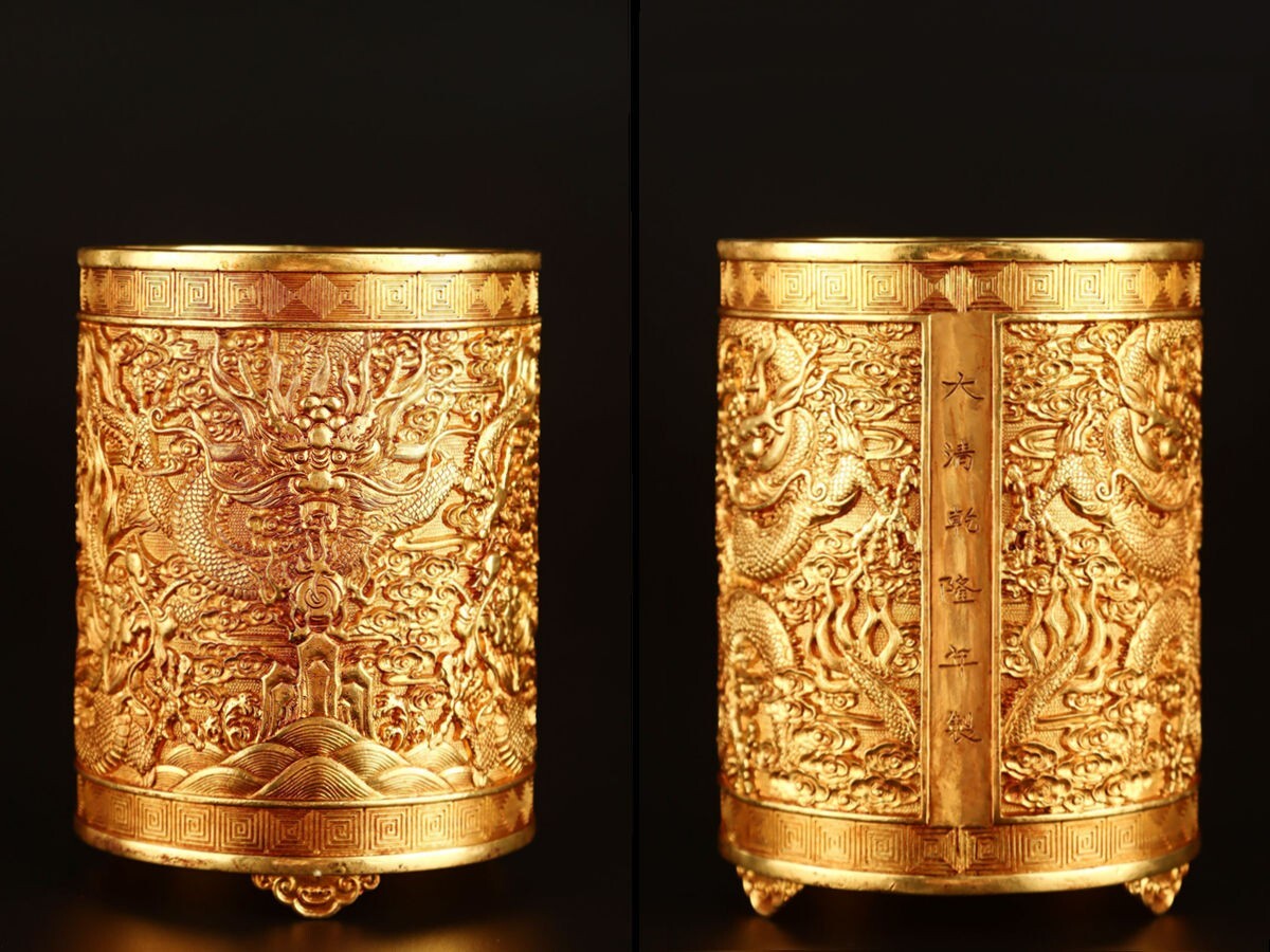 - 「清代 大清乾隆年製 古銅彫 塗金祥龍戲珠紋 筆筒」旧銅器 置物擺件 賞物 中国古美術 旧蔵出