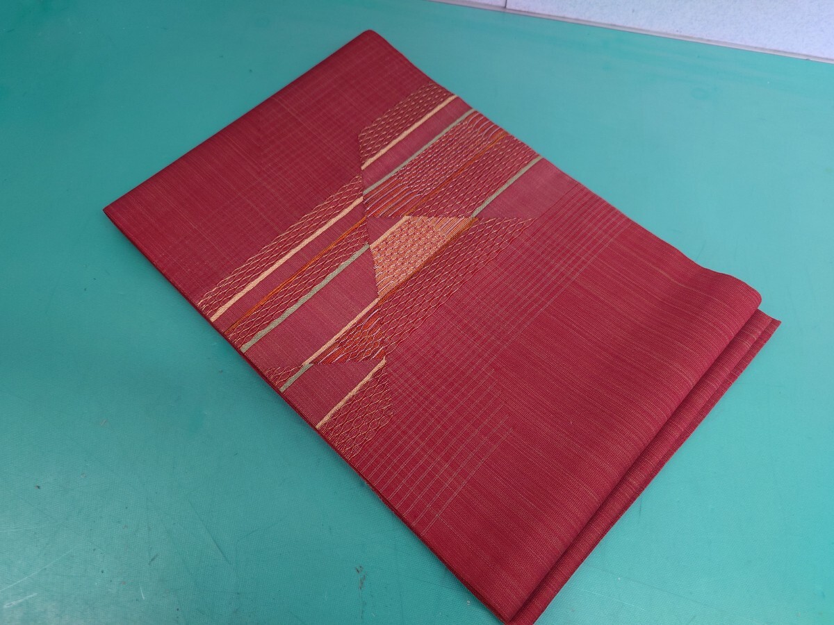 > ● 120 金糸 銀糸 繊細 デザイン 赤 ピラミッド 幾何学 模様 帯 名古屋帯 リメイク コスプレ 中古 ③
