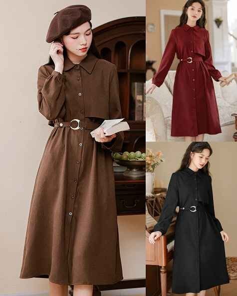 - 全3色 長袖ワンピース フリル 切り替え スリム 着痩せ 無地 sweet系 L ブラウン