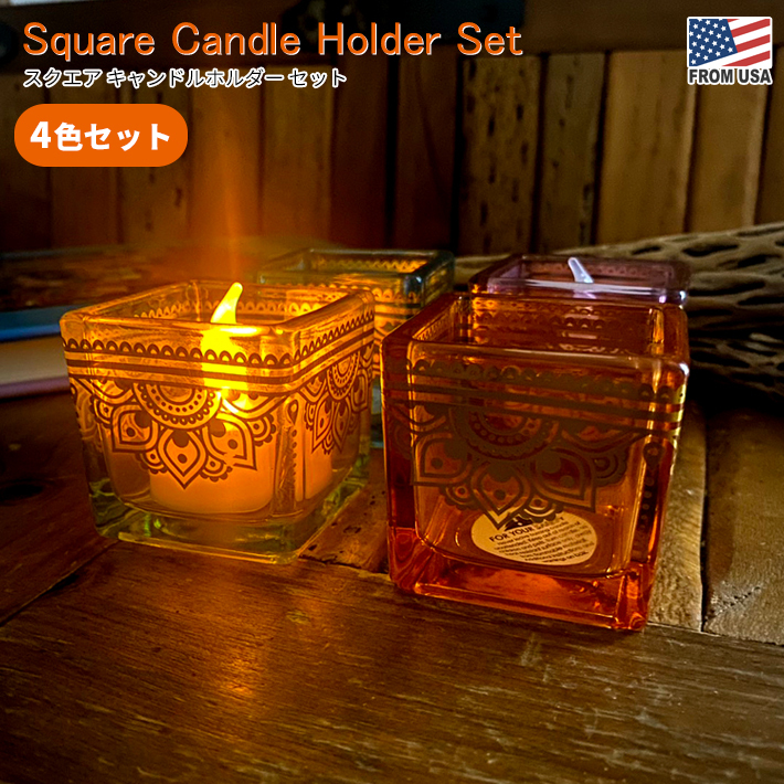 - スクエア キャンドルホルダー 4個セット ガラス ケース 4色 ロウソク 入れ物 瓶 キャンドルケース