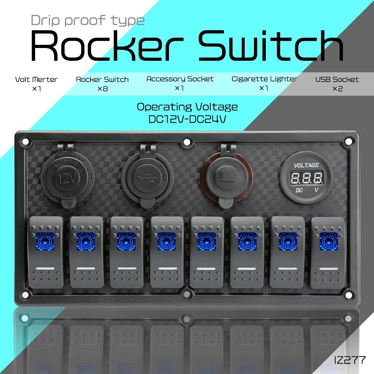 - 汎用 ロッカ スイッチ 8連 自動車 トラック ボートに 12V 24V兼用 LED パイロットランプ シガープラグ 電圧計 USB電源付き 防滴仕様 IZ277