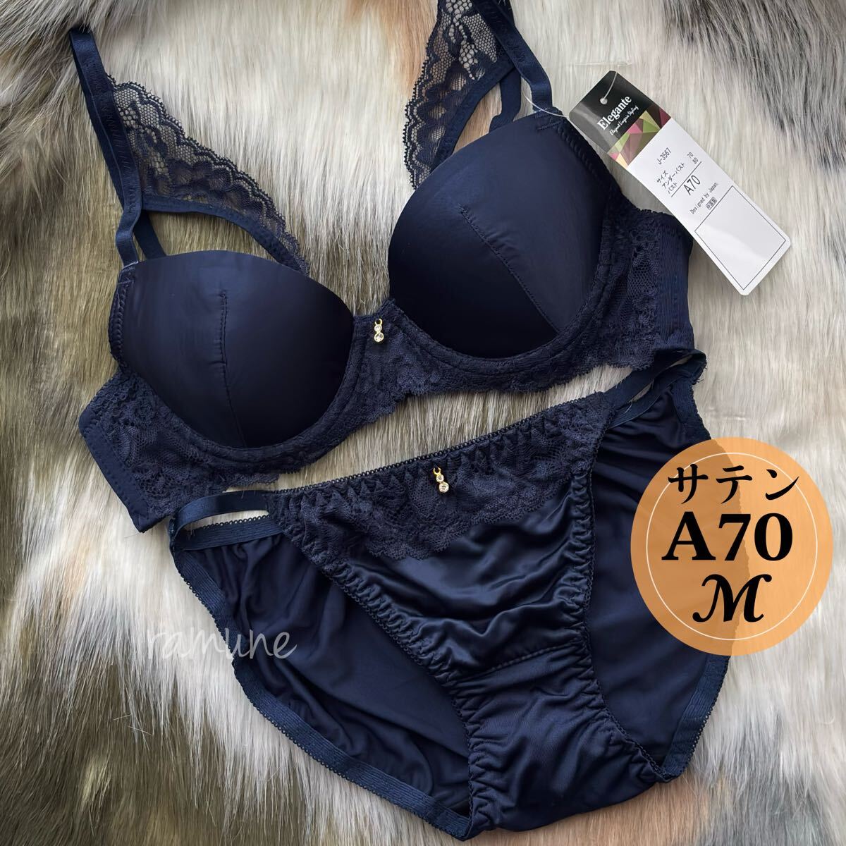 - 【A70M ネイビー サテン】新品 ブラ&ショーツ ブラジャーショーツ モールドカップ 脇高 ツルツル 光沢 寄せ上げ 小さいサイズ Aカップ