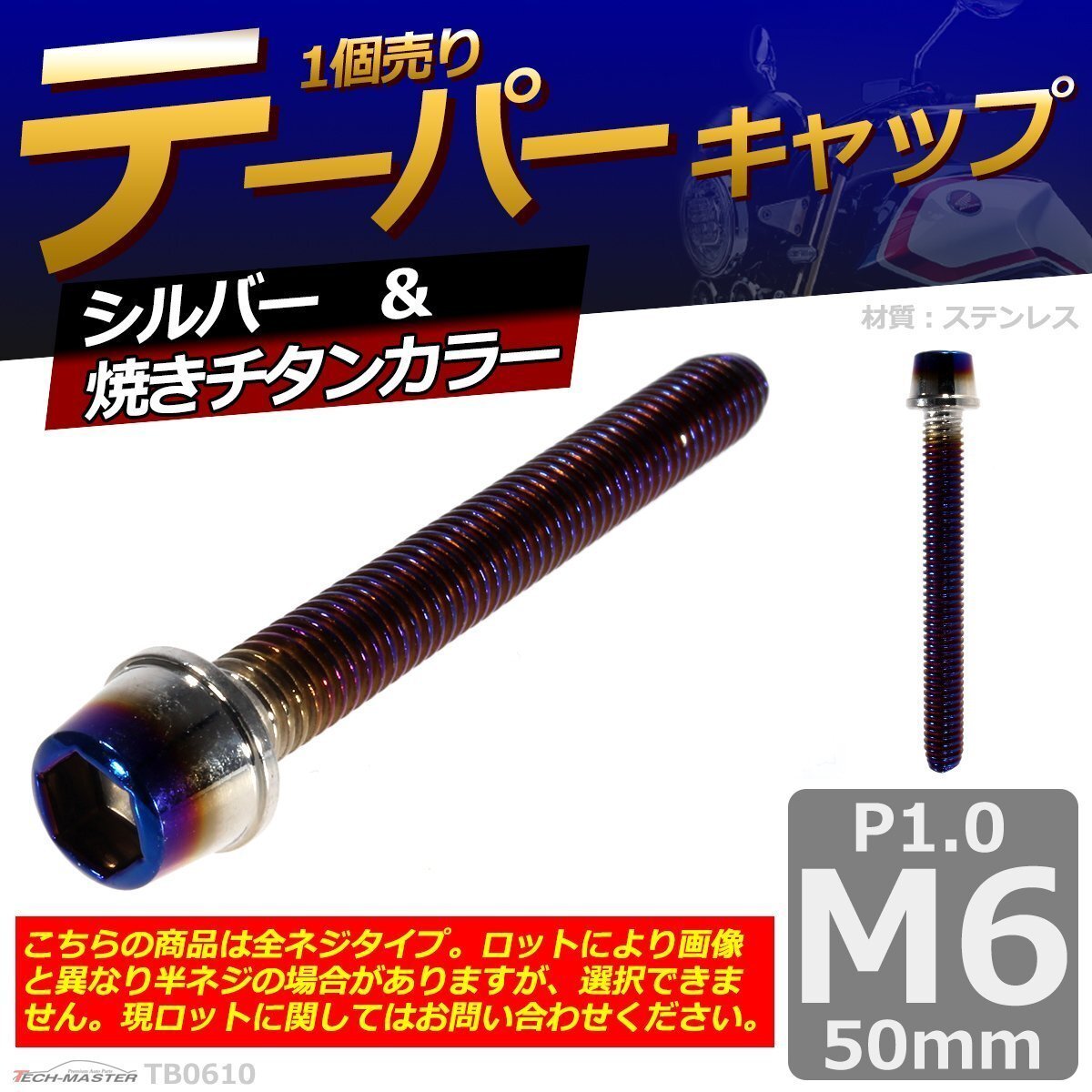 - M6×50mm P1.0 テーパー キャップボルト ステンレス 車/バイク/自転車 ドレスアップ パーツ シルバー&焼きチタンカラー 1個 TB0610