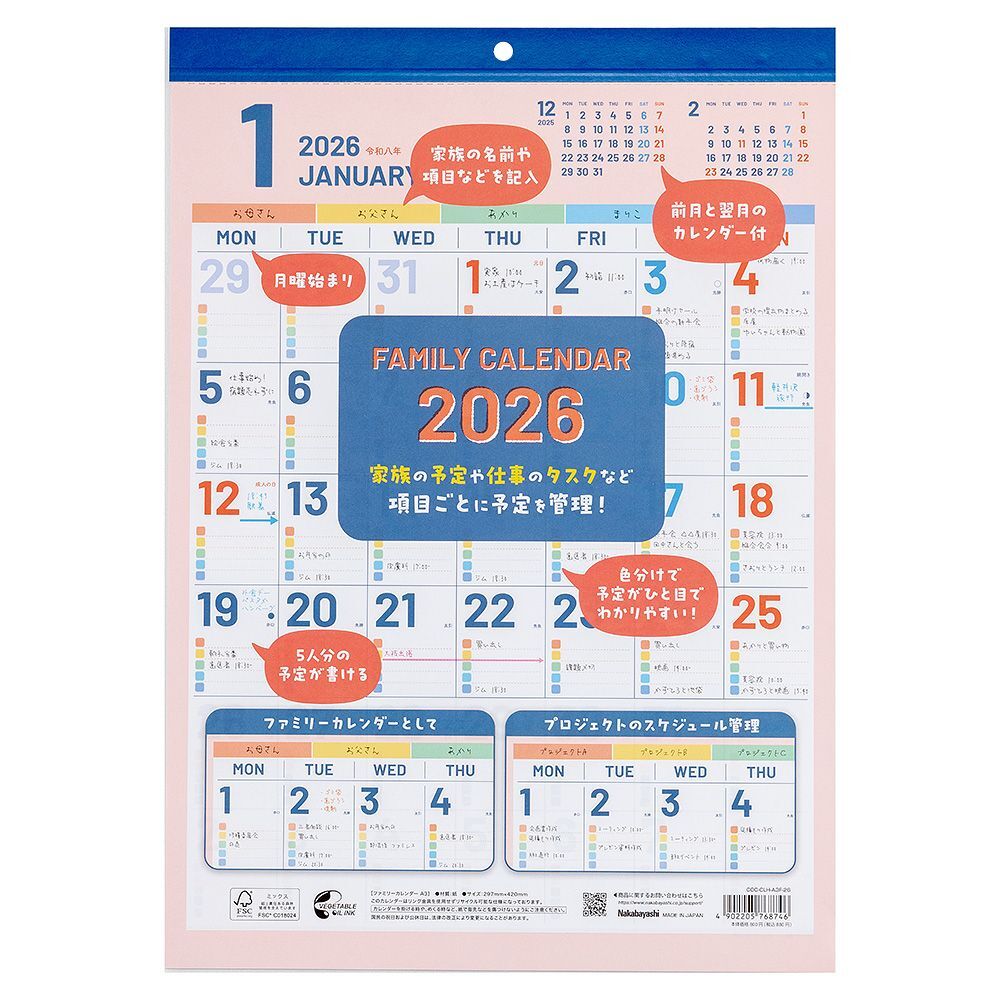 - (まとめ買い)ナカバヤシ 2026年 壁掛けカレンダー ファミリー(ブロックタイプ) A3 COC-CLH-A3F-26 〔×3〕