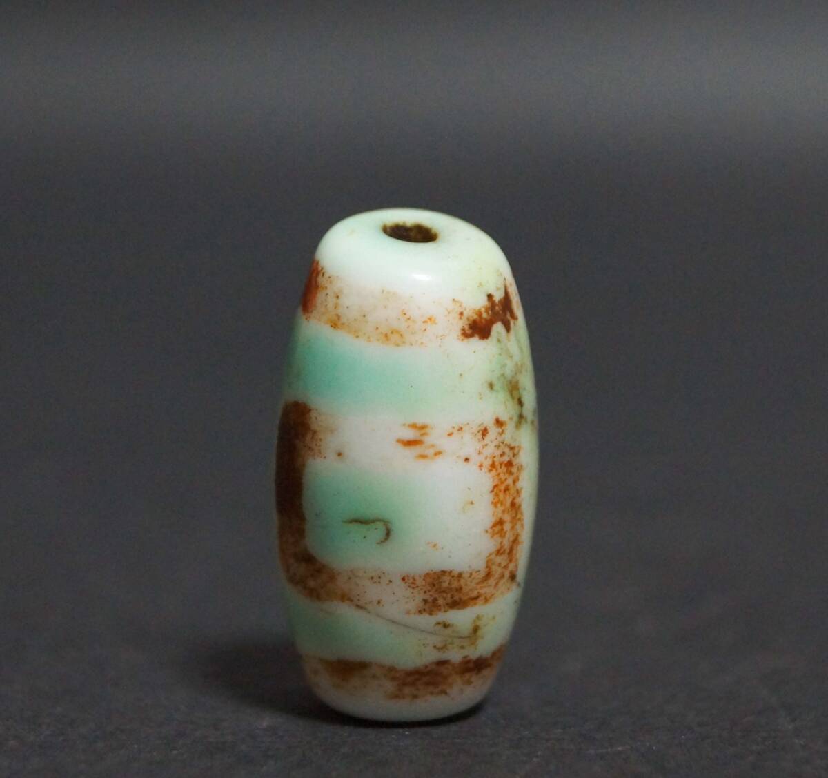 - 【閑】オールドチベット 風化メノウ瑪瑙 『天地天珠』根付 緒締玉 アゲート 提げ物Dziビーズ装飾品 お守り長さ2.7cm☆美しい石目☆7D0902