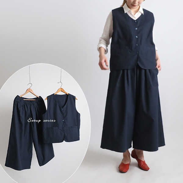> 秋支度SALE ベビーキャンバスコットン 上下セットアップ 後ろリボン紐付き ベスト ジレ 裏地付 ほぼ日ハバ広でいいパンツH68