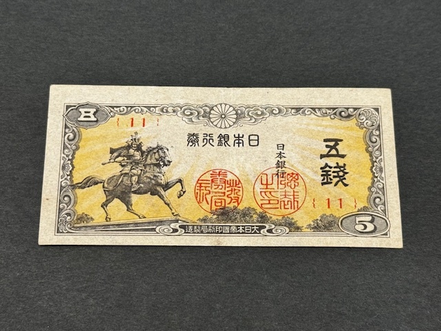 - 日本銀行券 楠公 五銭 5銭 札 紙幣 未使用
