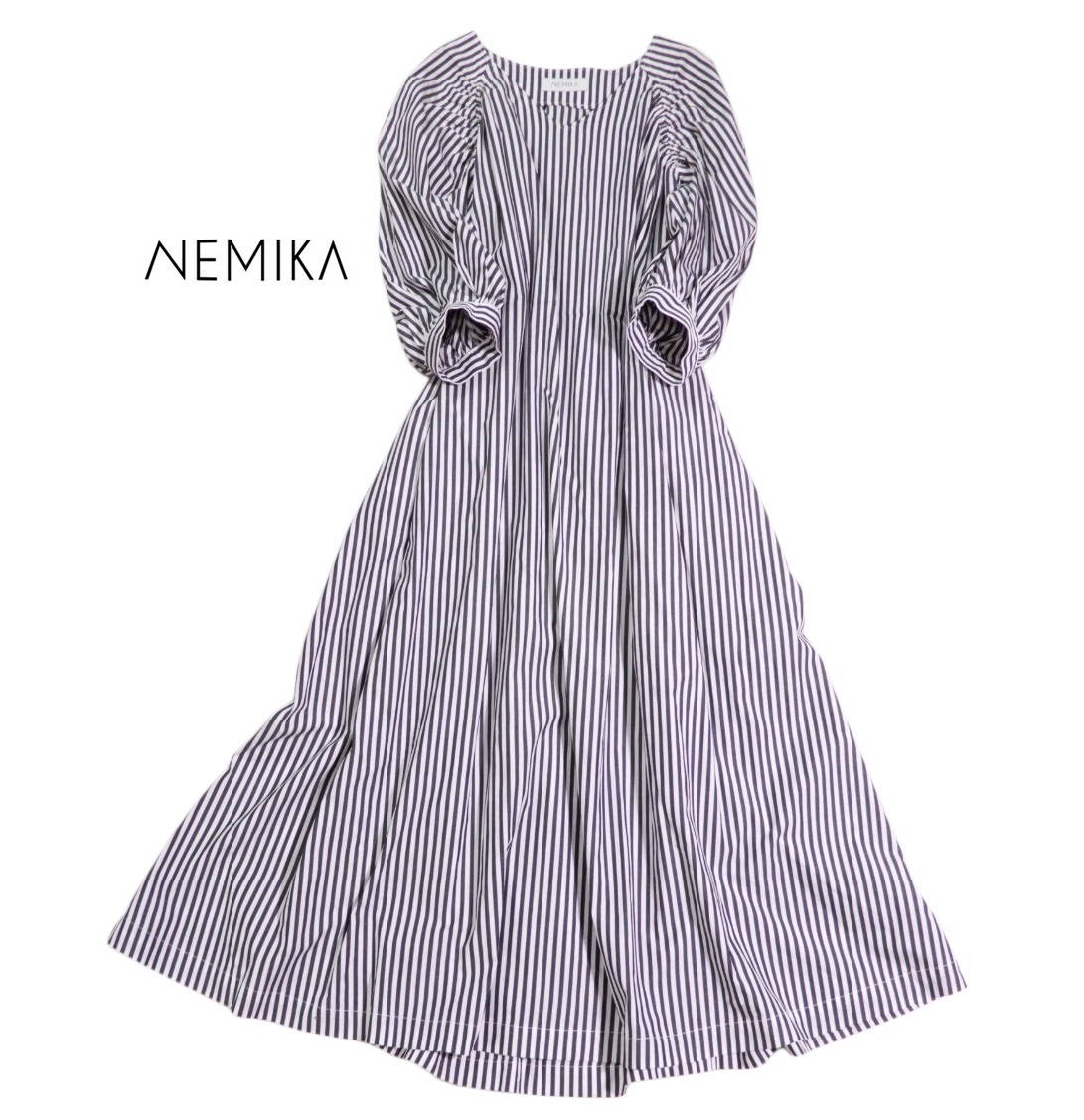 > 未使用 NEMIKA ネミカ レリアン ストライプ ふっくらスリーブ デザイン ロング Aライン フレア ワンピース 1