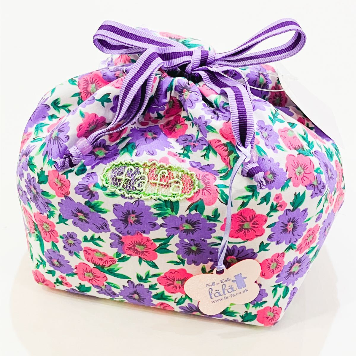> 【新品未使用】fafa フェフェ ランチポーチ パープル 花柄 紫 ピンク 保冷 保温 アルミシート 巾着袋 お弁当袋 かわいい 通学 通勤