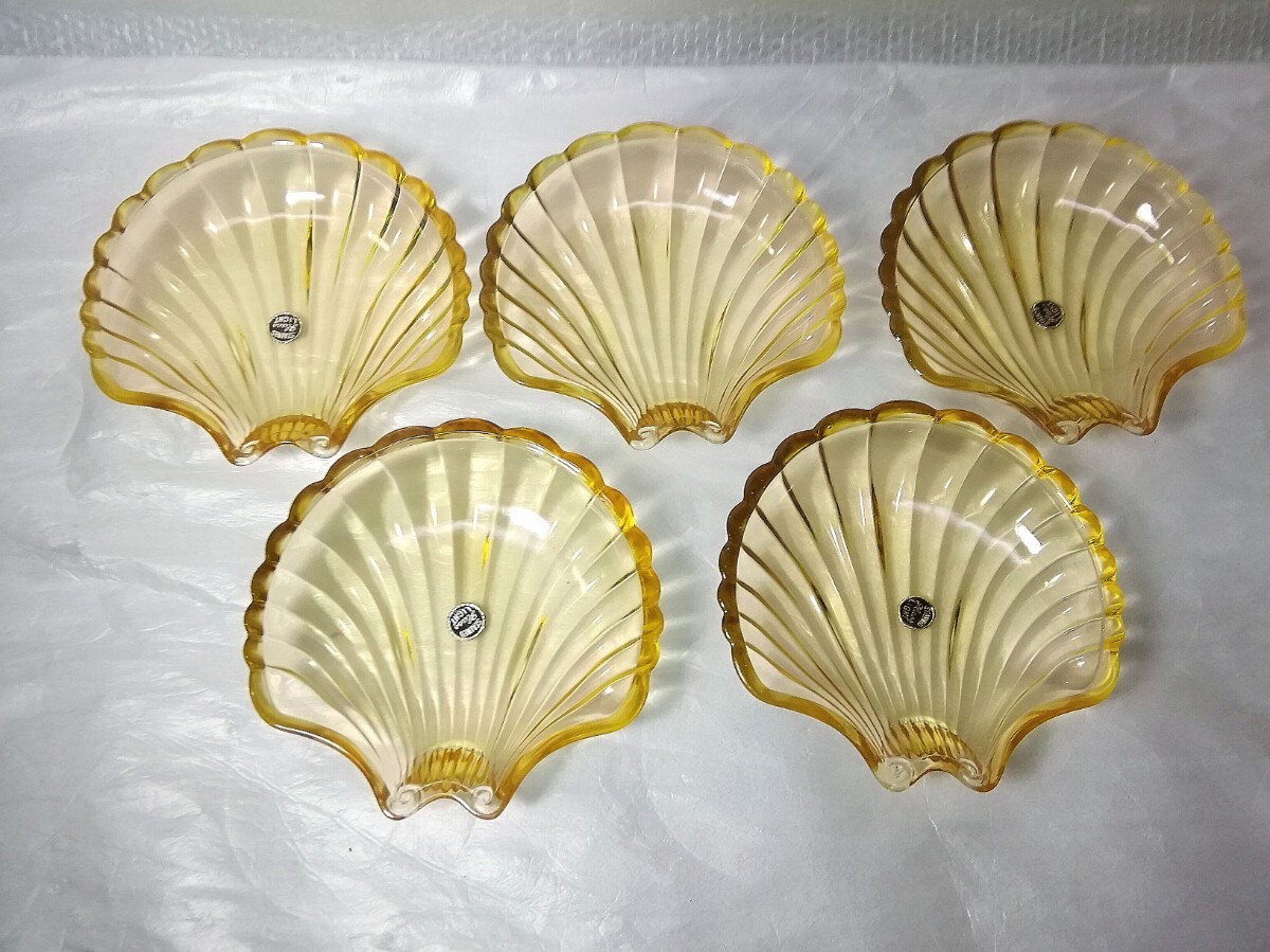 - STAINED GLASS LIGHT アンバー ガラス皿 貝殻皿 琥珀色 気泡入り プレス皿 5枚セット レトロ 【未使用】
