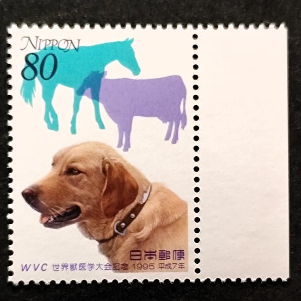> [25090611]【世界獣医学大会記念】単片「獣医学にかかわる動物たち ラブラドールレトリバー・牛・馬」盲導犬 救助犬 80円 1995年発行 美品*