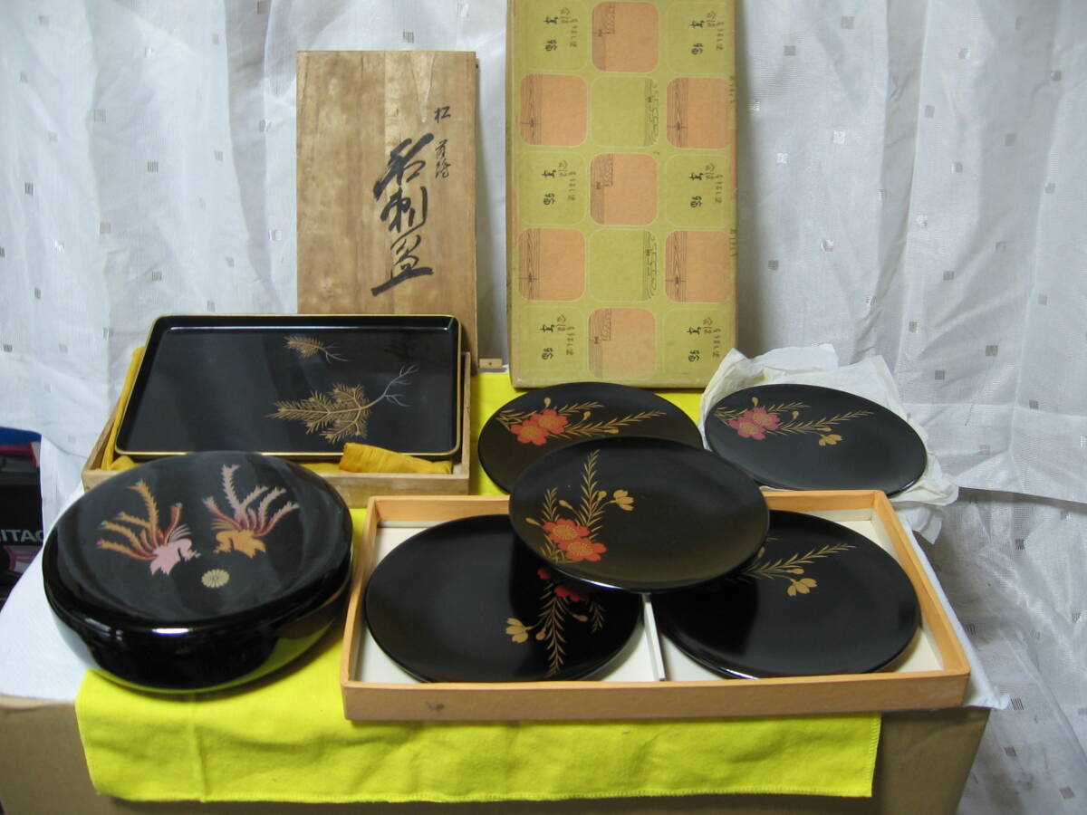 - 塗り物3点☆蒔絵入り☆蓋物1点☆名刺盆1点☆小皿5枚☆中古品