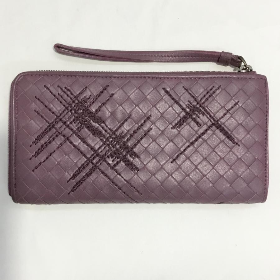 - 中古A ボッテガヴェネタ 財布 サイフ BOTTEGA VENETA 刺繍 イントレチャート 長財布 L字ファスナー ワイン系 箱付 保存袋付 145679