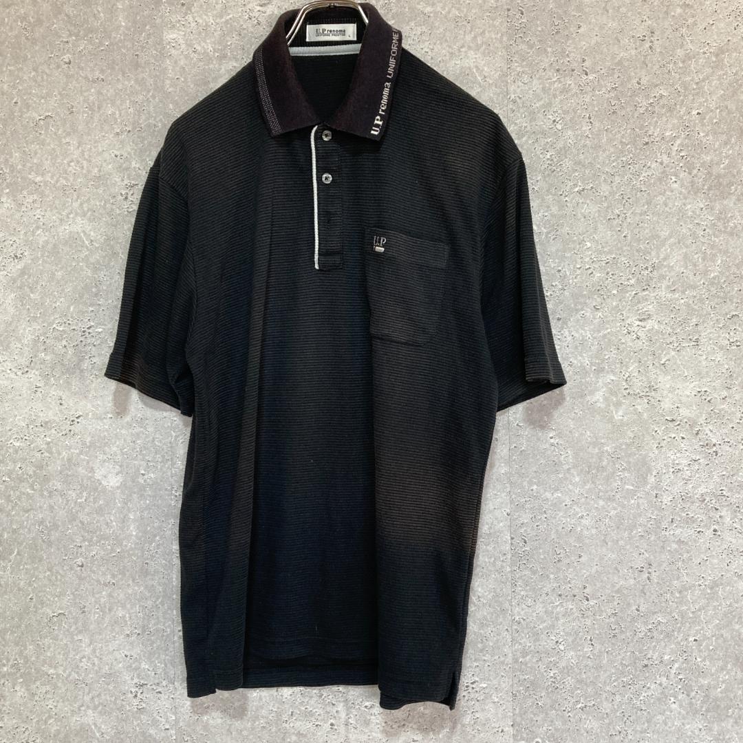 - ユーピーレノマ(L)半袖ボーダーポロシャツ*胸ポケット*ロゴ*伸縮性*ブラック