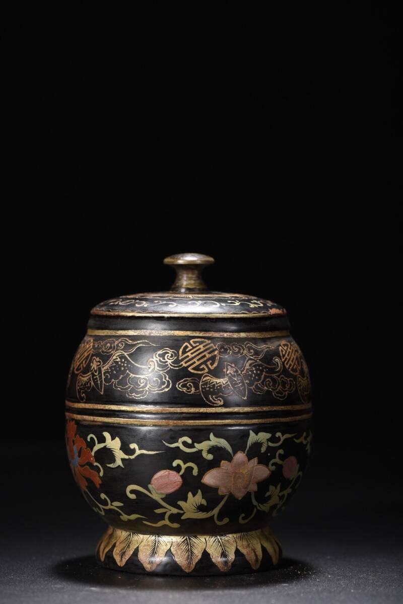- 蔵友旧蔵出 木胎漆器彫 描真金 花卉紋 蓋盒 供養品 置物擺件 古賞物 中国古玩 中国古美術品