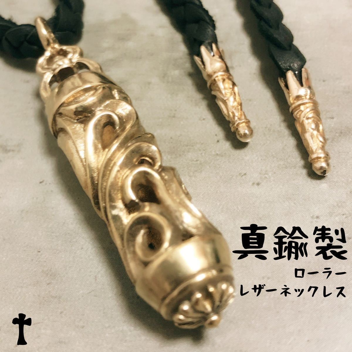 > 真鍮 BRASS ローラー レザー ネックレス スクロール 唐草 模様 ブラス 流線 波 デザイン ペンダント トップ 三つ編み 鹿紐