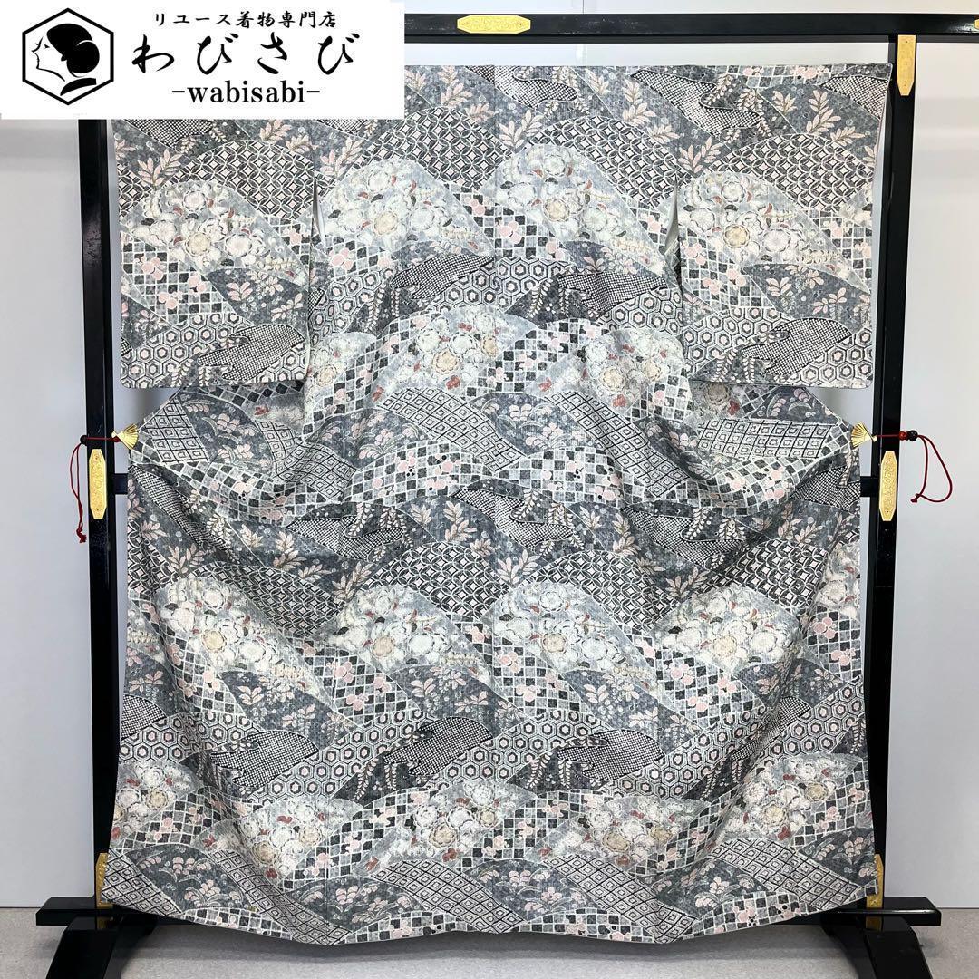 > 小紋 辻が花 寄せ柄模様 金彩 乳白色 ふくよかサイズ K-3779 着物 きもの kimono 和服 和装 中古 リサイクル着物 【送料無料】