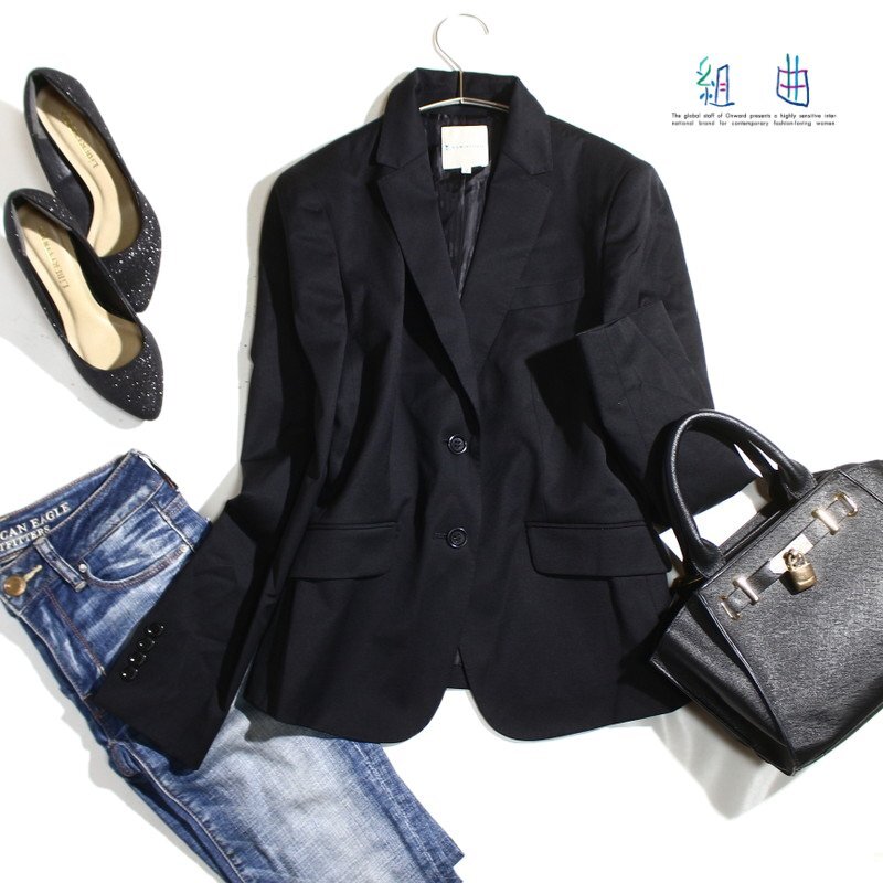 > 美品 組曲 クミキョク 株) オンワード樫山 合物 ウール混合 絹 スーツ ジャケット 9号 2 ブラック 黒 オフィス ビジネス 通勤 綺麗め