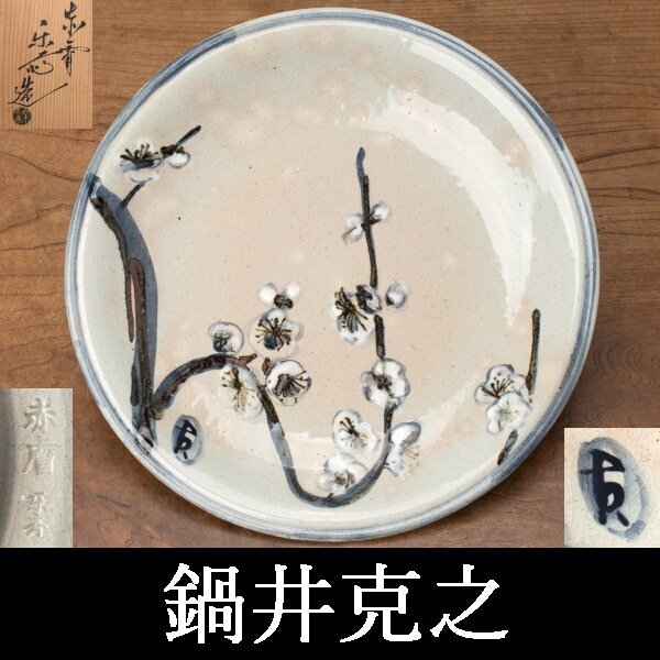 > 【千h0766】鍋井克之 絵付け 皿 幅約31.5cm 共箱 赤膚焼 赤ハダ 尾西楽斎 楽斎