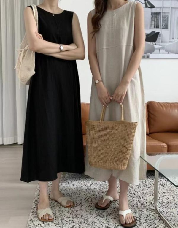 > 新入荷*高品質 ワンピース マキシワンピース ノースリーブ ロングワンピース 袖なし シンプル 着痩せ 無地 ライン フレア ワンピース * 黒
