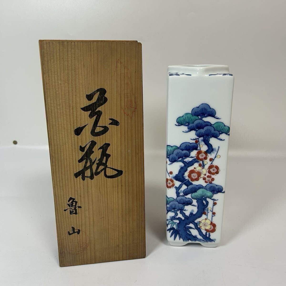 > 未使用 有田焼 色鍋島 魯山 染錦松竹梅鳥 花瓶 角花瓶 花器 花入 置物 インテリア フラワーベース ム23