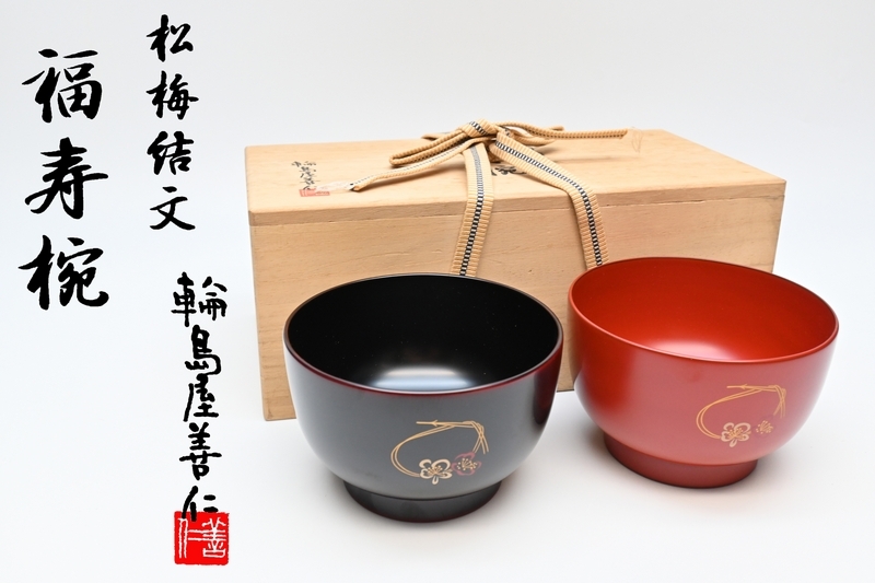 - 最高級 輪島屋善仁 輪島塗 ■ 福寿椀 松梅結文 [ 溜塗 朱塗 ]二客 裏印 ■ 天然木 漆塗器 共布 共箱入り ■