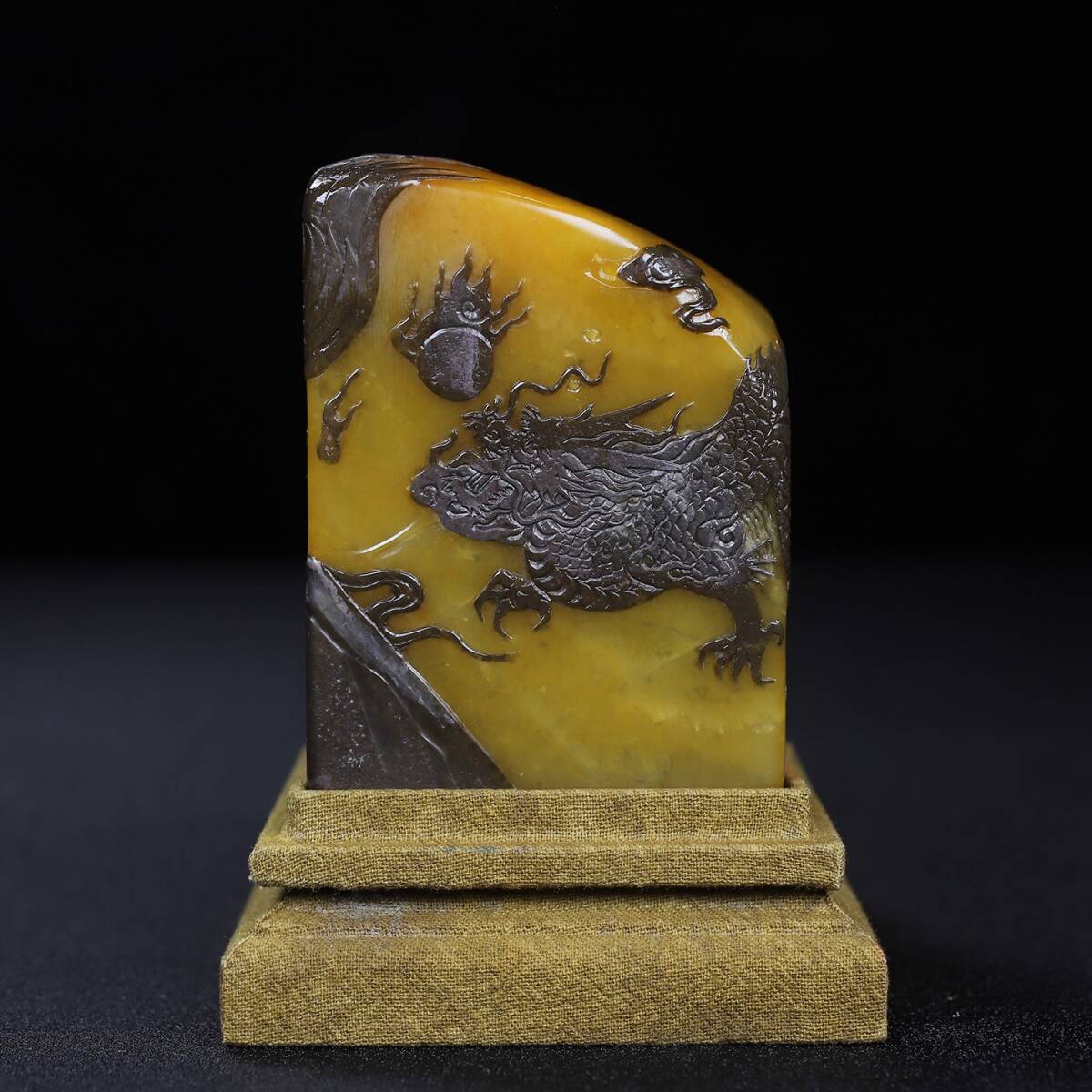 - 【超珍館蔵】寿山石 烏鴉皮 田黄石 細密彫 龍鳳呈祥紋印章 印章 印鑒 文房具 書道品 古賞物 古董品 古美術品 時代物 旧家蔵出 稀少珍蔵品