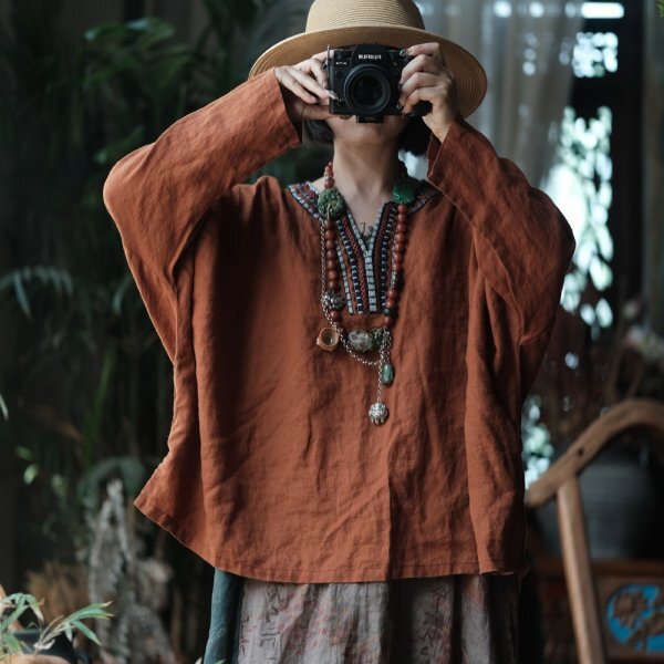 - lgn 2509 チュニック Vネックトップス 刺 麻100% 洋服ミックス アンティーク風 ロマンファッション ゆったり フリーサイズ