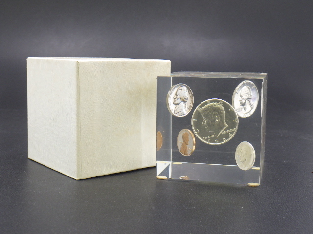 - h5I035Z- 未使用 ペーパーウェイト アメリカ 硬貨 1964年 5種コインセット ケネディ銀貨含む インテリア 置物 クリスタル ②