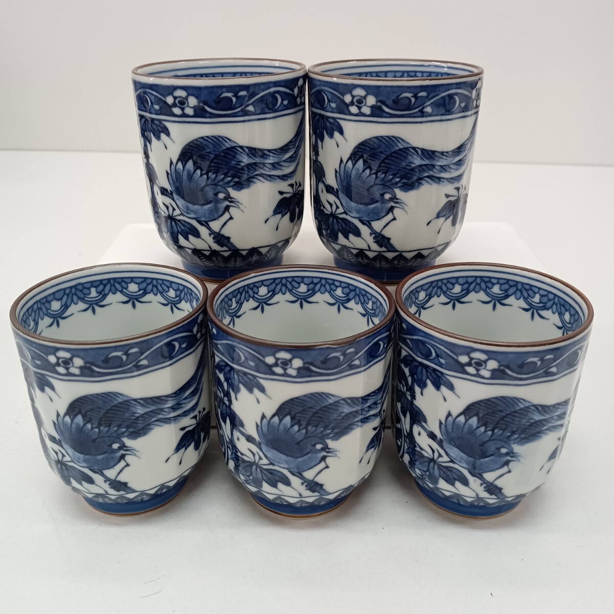 - T3 英祥窯 湯呑 湯呑み 染付 花鳥柄 5客セット 5客揃 茶器 食器 和食器 陶器 現状品