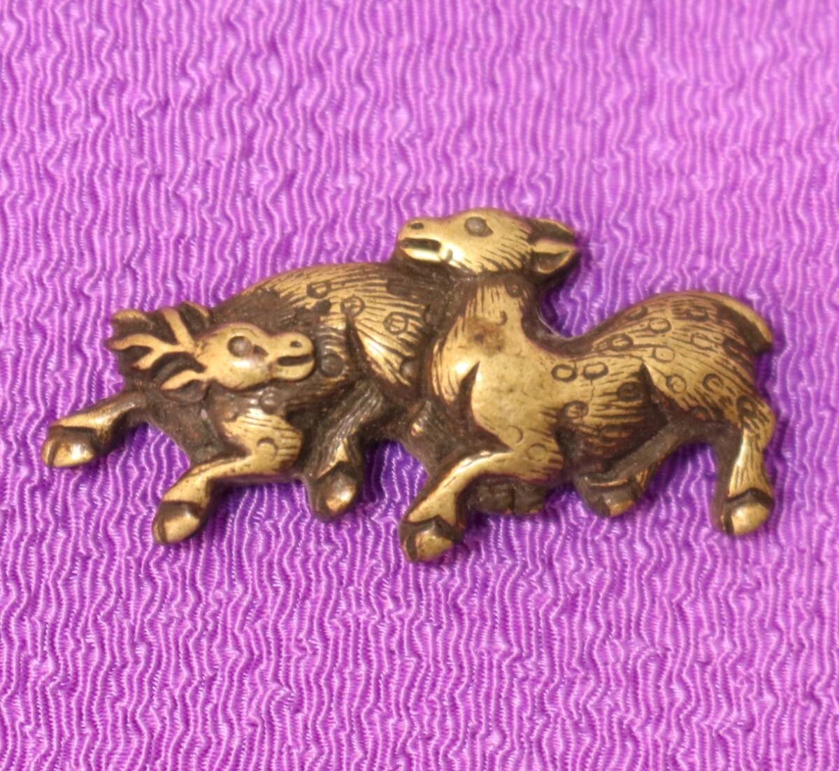 - 黄銅に毛彫、時代目貫~鹿二体図~煙草入用 骨董 古民具 アンティーク レトロ