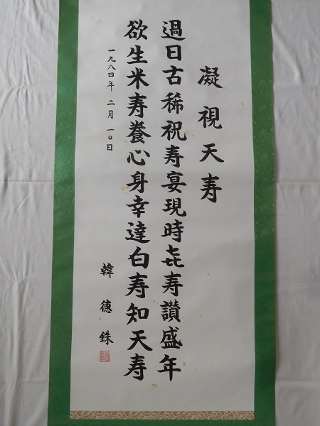 - 【印刷】掛け軸 韓徳銖 書「凝視天寿」朝鮮総連初代議長 朝鮮大学校初代学長 紙本