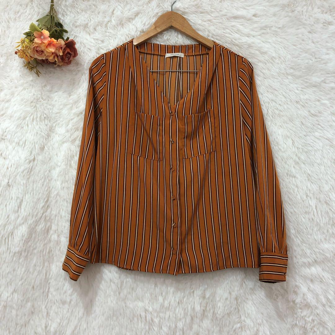 - ★オペークドットクリップ★ ノーカラー ストライプ シャツ 【L】 オレンジ