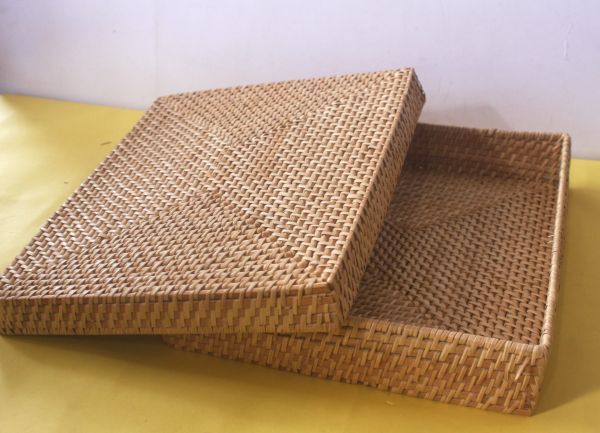 - 天然素材 蓋つきラタンボックス 籐編みの小物入れ 箱 バスケット サイズ:約33×41×H8.5㎝/20N9-31