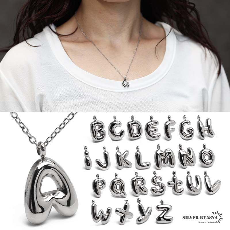- (B) ステンレス イニシャルネックレス ぷっくり アルファベットネックレス シルバー レディース 女性 金アレ対応