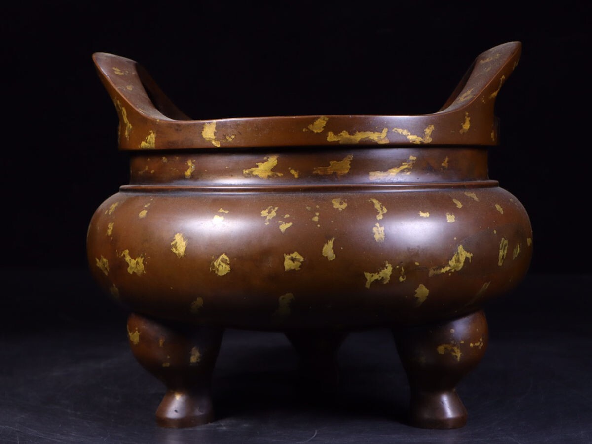 - 「清代 乾隆年製 古銅彫 點金 三足橋耳老銅香炉」旧銅器 置物擺件 賞物 中国古美術 旧蔵出