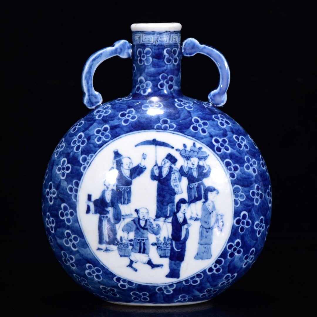 - 【超珍館蔵】清 乾隆年製款 古陶瓷品 青花 人物故事紋 扁瓶 陶藝 古賞物 古董品 古美術品 時代物 旧家蔵出 稀少珍蔵品