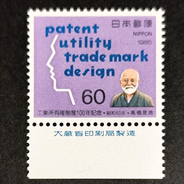 > [25091134]【工業所有権制度100年】単片 銘版付「横顔と制度の柱の英枠と高橋是清」60円 1985年発行 美品