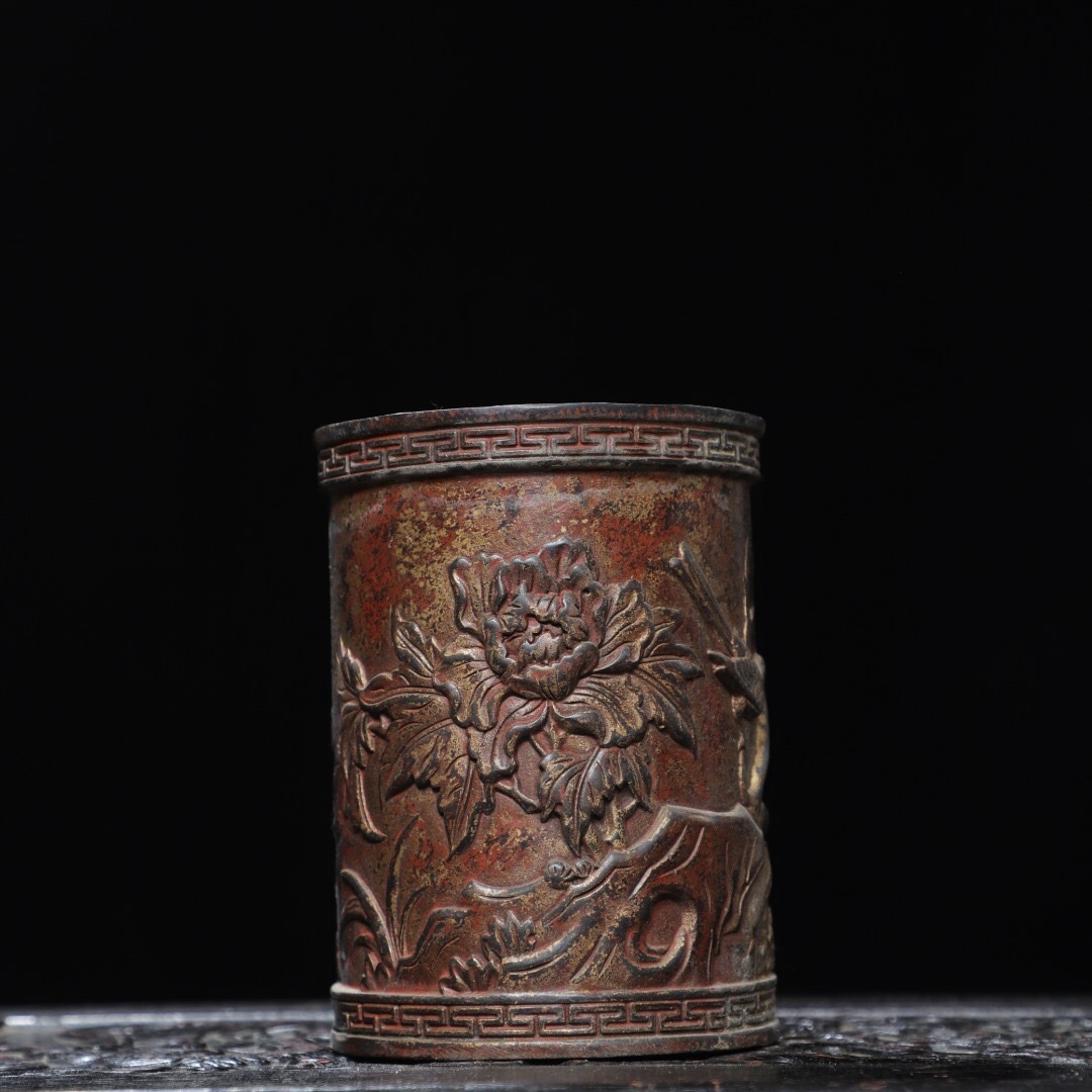 - ▽鴻▽ 銅製 拓金 牡丹紋 筆筒 置物 賞物 古賞物 古董品 時代物 稀少珍品 中国古玩 中国古美術