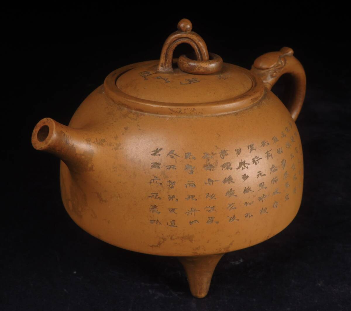 - 中国美術 漢詩文三足急須 朱泥 紫砂壺 銘「周桂珍」茶道具 水注 中国古玩 唐物 時代 作家 骨董品 古美術品 全長17cm【913】