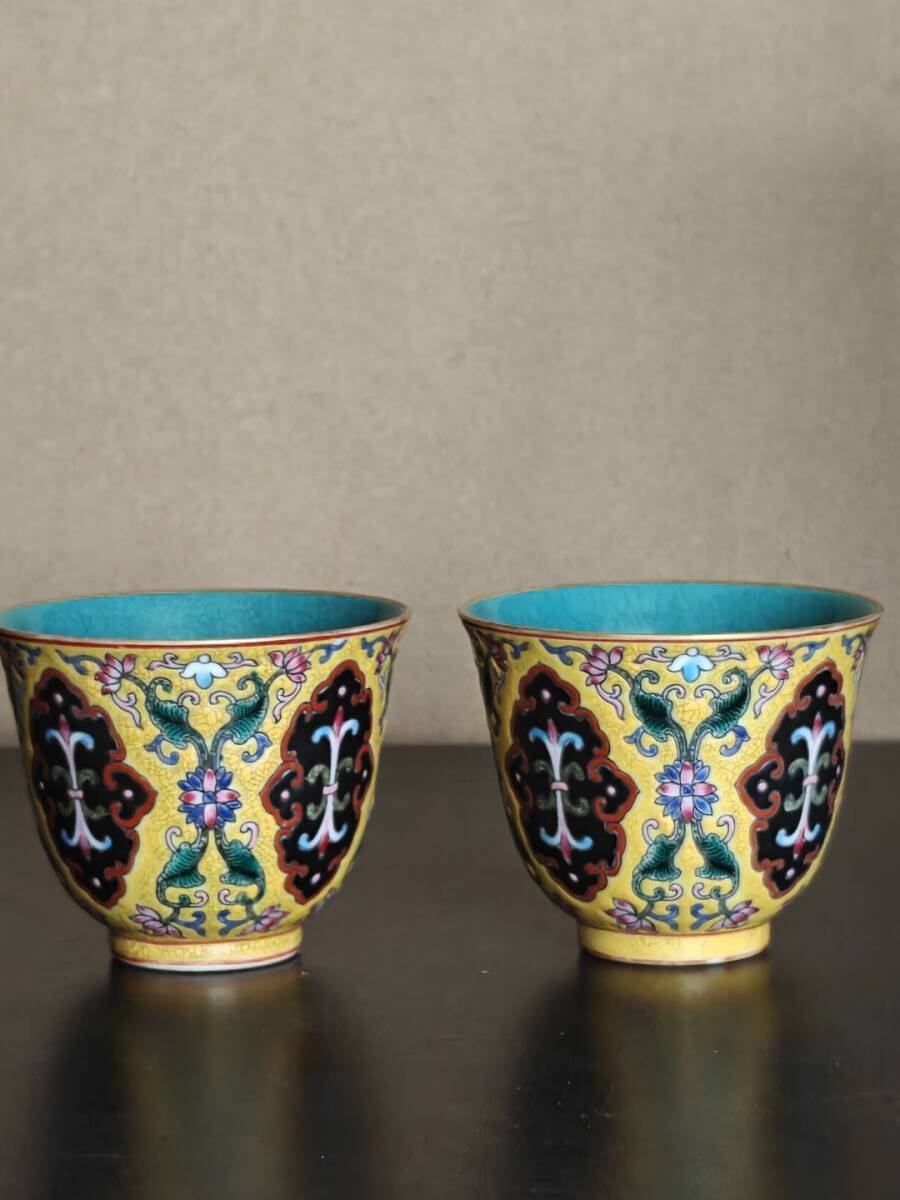 > 9+GV8627「東洋美術」 中国骨董 人間国宝 磁器製品【小さなエナメルカップ2個】 旧物 孤品 珍品 陶磁器 収蔵価値が高い
