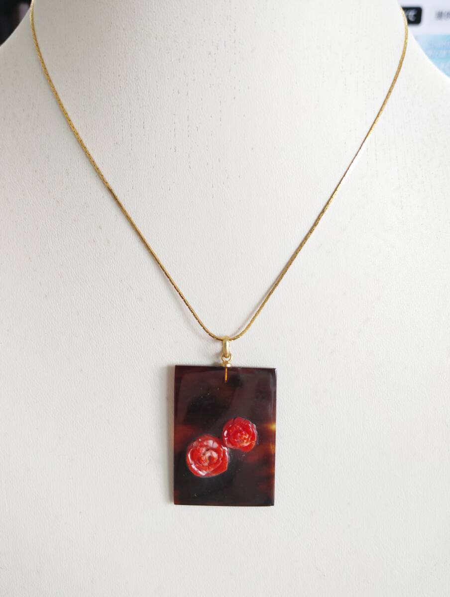 - べっ甲ネックレスペンダント・珊瑚バラ彫刻付・希少品