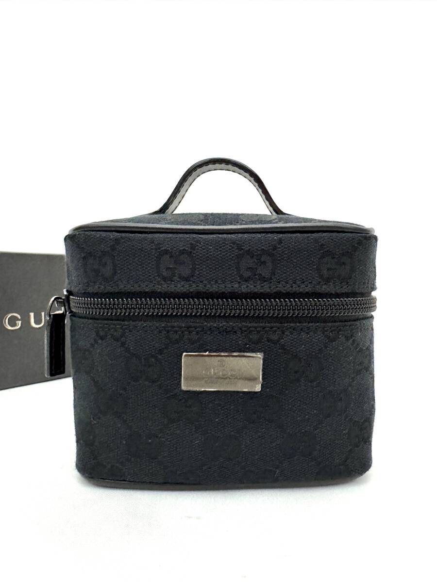 > 7I1402【本物保証】グッチ バニティ メイク 化粧 ポーチ ミニ ハンド バッグ GG 柄 ブラック ロゴ プレート GUCCI
