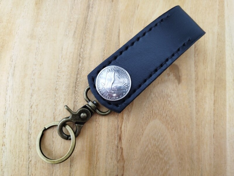 - レザーキーホルダー ブラック ベルトループ 姫路レザー ヌメ革 クォーターコインコンチョ アメリカンイーグル 本革 牛革