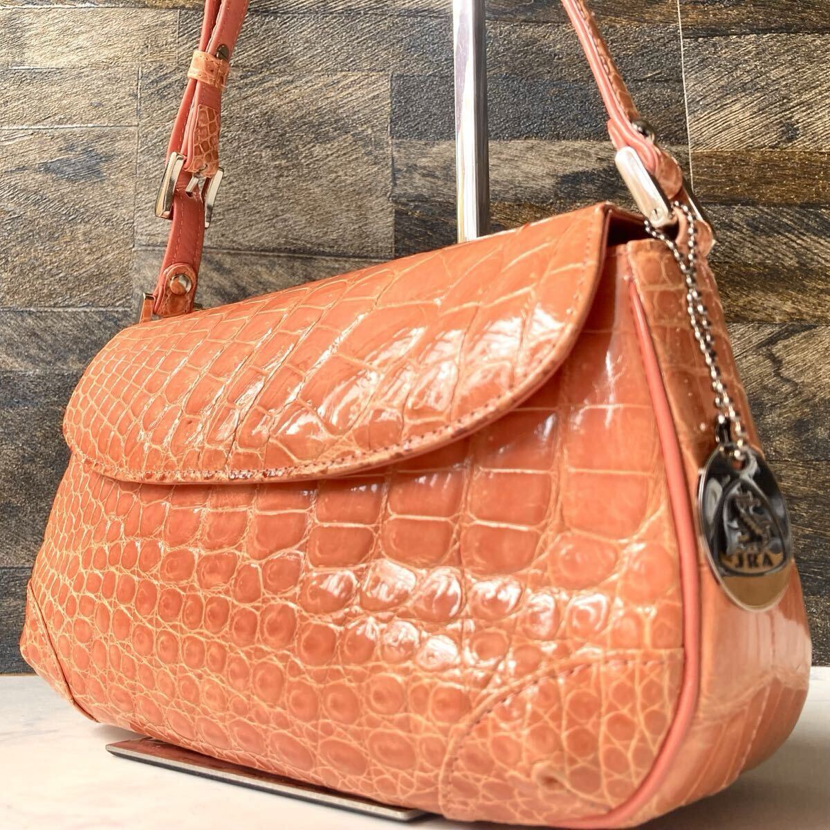 - 美品 JRA シャイニングクロコダイル アクセサリーポーチ ハンドバッグ ショルダー 肩掛け ワニ革 エキゾチックレザー オレンジ